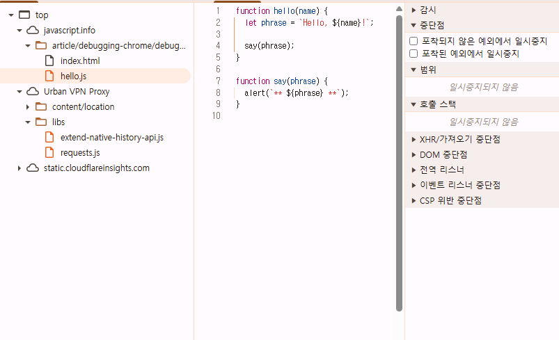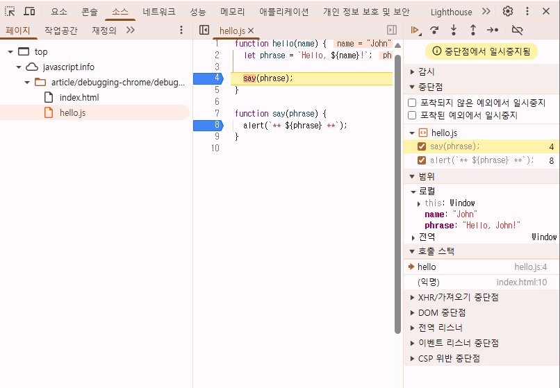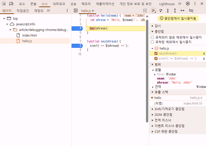 현재 디버거는 hello () 스크립트에서 호출되는 index.html 호출 내부에 있음. (함수가 없으므로 "익명"이라고 함. )