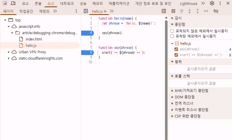 실행이 재개되어 내부에서 또 다른 중단점에 도달하여 say() 에서 멈춤. 오른쪽의 "호출 스택"을 살펴보면 알 수 있음.